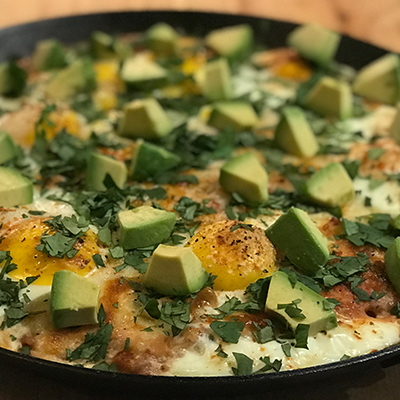 Fresh Guacamole, shaved egg and a variety of fresh toppings atop thick cut Artisan Bread served with Scrambled Eggs and Fresh Fruit