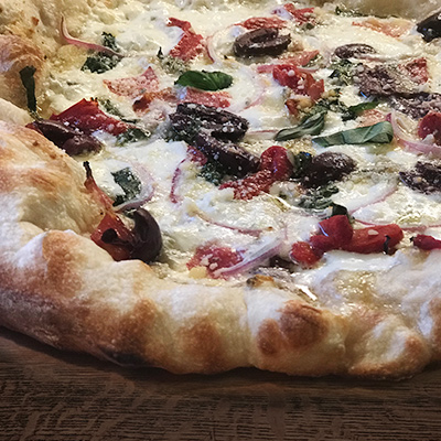 Grilled flatbread topped with seasoned ricotta, optional salami or pepperoni and topped with Italian green salad and Kalamata olives.